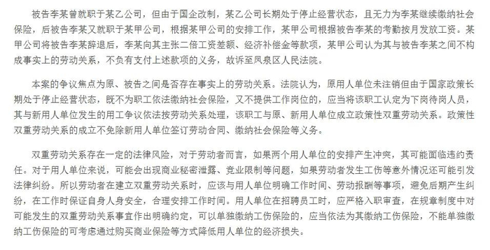 二是法律账。待岗员工想外出工作,合同签订是关键。人虽待岗,劳动关系和社保仍在原单位,此时去新单位上班,法律支持签正式劳动合同。根据最高人民法院相关解释,企业停薪留职、下岗待岗人员与新单位用工争议按劳动关系处理。河南高院也有明确案例,原单位无力缴社保时,职工与新单位形成“政策性双重劳动关系”,新单位需承担相应义务。