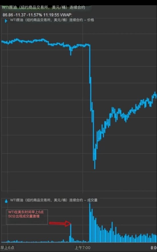 分析师称,6点49分起的两分钟内,至少对应600万桶布伦特和西德州中质原油的期货被卖出。而在此前五个交易日的同一时间段,平均成交量仅约700手(约70万桶)。特朗普在Truth Social上的发帖时间大约是7点05分。