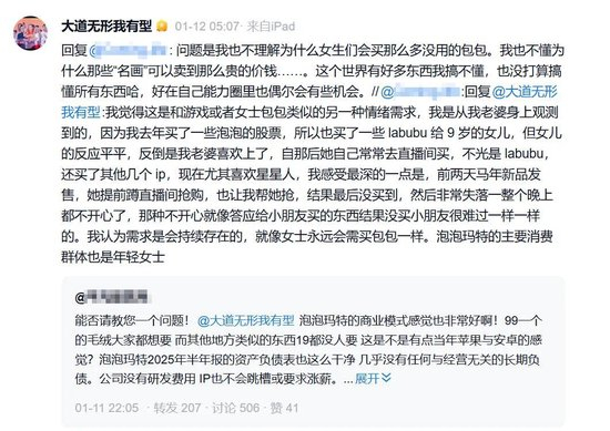 有网友表示,泡泡玛特提供的是和游戏或者女士包包类似的另一种情绪需求。段永平回应:“问题是我也不理解为什么女生们会买那么多没用的包包。我也不懂为什么那些‘名画’可以卖到那么贵的价钱……。这个世界有好多东西我搞不懂,也没打算搞懂所有东西哈,好在自己能力圈里也偶尔会有些机会。”