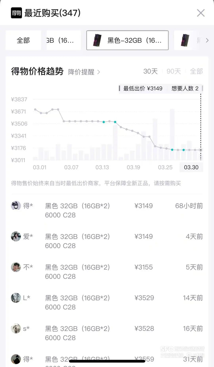 小红书社交平台上,也开始出现了“内存现在能买了吗”“囤的内存亏麻了”等讨论,个人卖家出售闲置内存的帖子明显增多。而在得物潮玩社区平台上,32G DDR5内存条价格在3月5日达到最高价,约3699元一条,目前已经回落至3149元左右,降价幅度达550元。