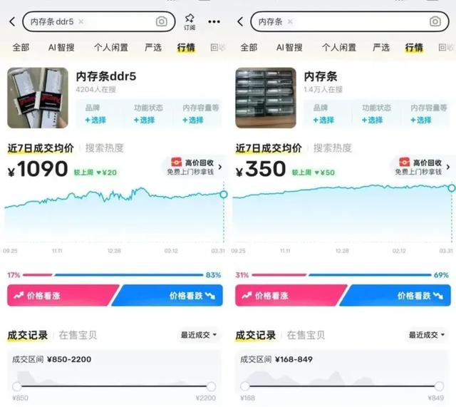 据21世纪经济报道,3月30日,记者查询某二手平台,内存条近7日的成交均价较前一周下跌50元,报350元;DDR5的成交均价较前一周下跌20元,报1090元。