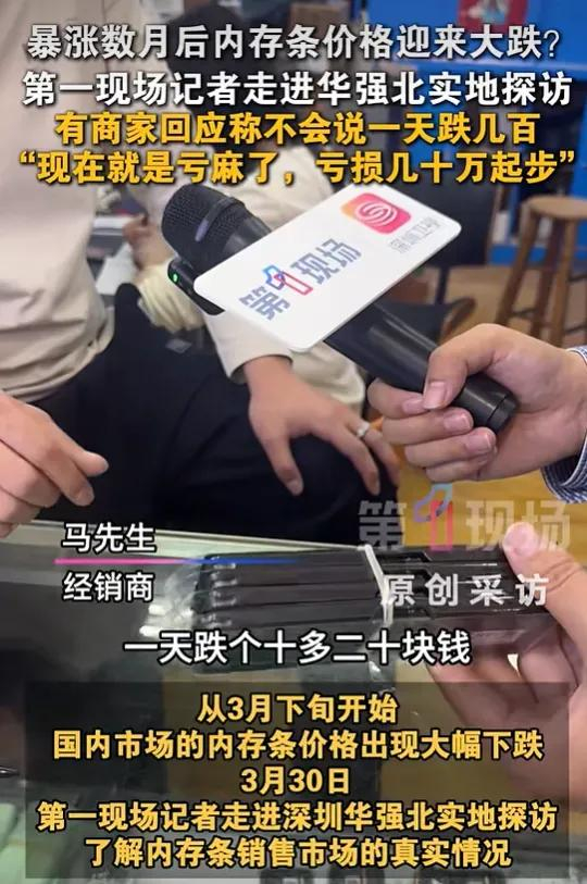 3月30日,第一现场记者走进深圳华强北实地探访,了解内存条市场的真实情况。有商家回应称不会一天跌几百,没那么夸张。不过现在就是亏麻了,估计亏损几十万起步。
