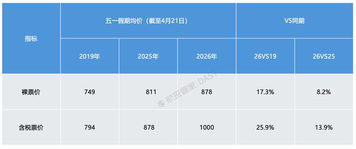 与国内机票“含税价破千”形成鲜明对比的是,部分出境目的地的机票价格不升反降。据航班管家统计,2026年“五一”经济舱国内含税票价约为1000元,同比2025年上涨13.9%,较2019年上涨25.9%。然而,国际航线票价并未呈现同样的上升走势。这背后的推手不是需求,而是新增航线。
