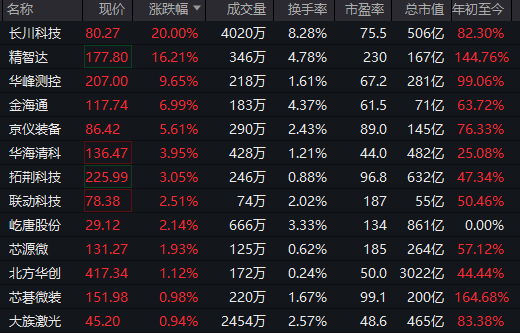 半导体设备概念股大面积高开,长川科技20%涨停,精智达、华峰测控、金海通等跟涨。