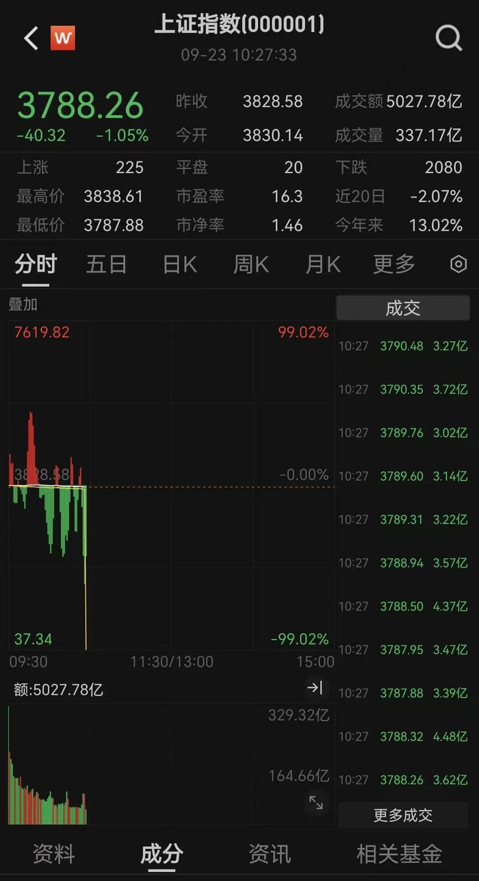 9月23日开盘,A股三大指数震荡调整。截至发稿,沪指跌1.05%。两市超4900只个股下跌。