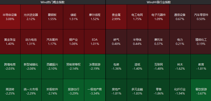 板块上来看,半导体设备板块走高,电子元器件、通信设备、储能等板块表现活跃,贵金属板块震荡拉升;而餐饮旅游板块走低,化纤、零售、房地产等板块震荡调整。个股方面,超4500只个股下跌。