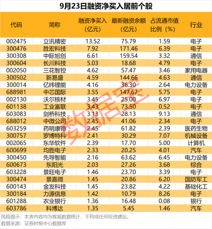具体到个股,9月23日获融资净买入千万元以上的有478只,其中36只融资净买入额超亿元。立讯精密融资净买入额居首,当日净买入13.52亿元;其次是胜宏科技、中际旭创,融资净买入金额分别为7.92亿元、6.61亿元;融资净买入金额居前的还有长川科技、三花智控、新易盛等。