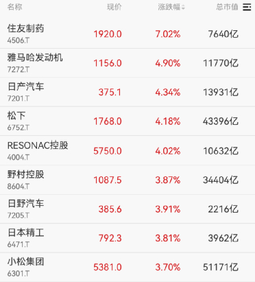 个股方面,住友制药、雅马哈发动机、日产汽车、松下等涨幅居前。