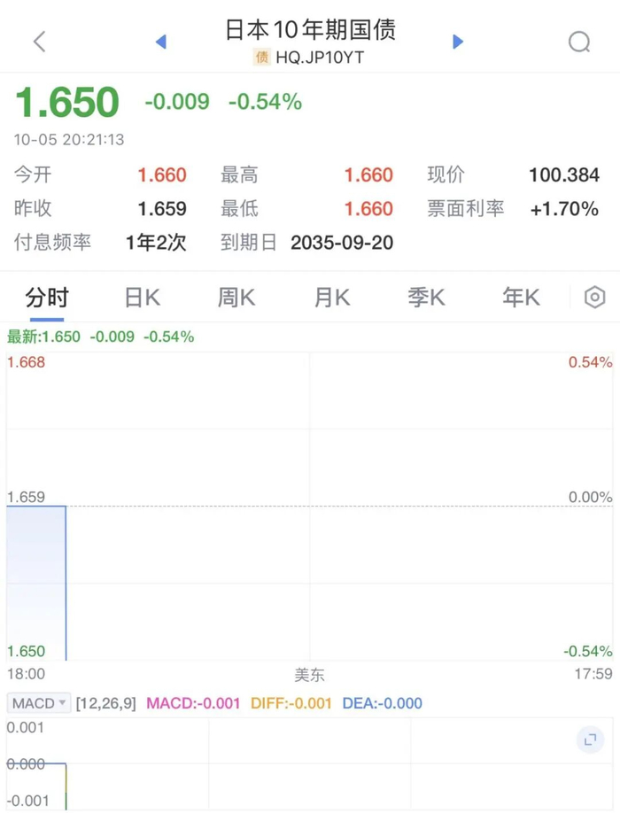 10年期日本国债收益率上涨0.5个基点,至1.65%。