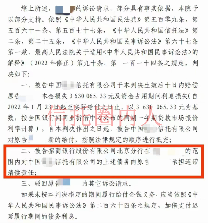 信托圈内人了解到,目前,XX信托已被托管,自身和大股东均无法履行赔偿责任,招商银行北京分行完全有能力赔偿,保管人的部分连带清偿责任是可以落实的。