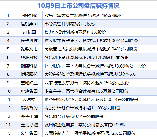 据统计,10月9日,盘后润泽科技、运机集团、ST长园、模塑科技、乾照光电、华旺科技、麒盛科技、侨银股份、宝地矿业、华建集团、天汽模、瑞纳智能、盛美上海、金力永磁、公牛集团等15家上市公司披露减持情况。当日暂无上市公司披露增持情况。