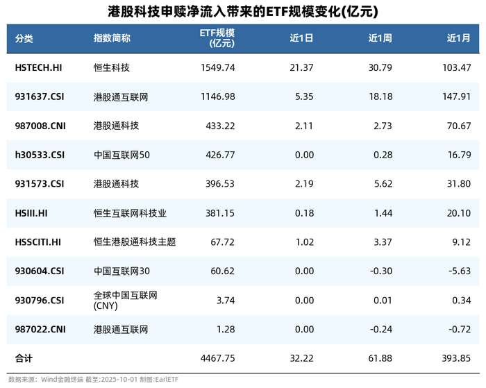 从资金流向看,下表是港股科技类指数截至 9 月底(发布于 10 月 1日)因为申赎带来的净流入,可以看到恒生港股通科技主题指数虽然规模不靠前,但是过去 1 个月流入的金额如果以比例计算,算是比较靠前的。目前跟踪这一指数规模最大的是港股通科技ETF(159262.SZ),规模 55 亿元左右,它也有场外联接基金A/C类025197/025198。