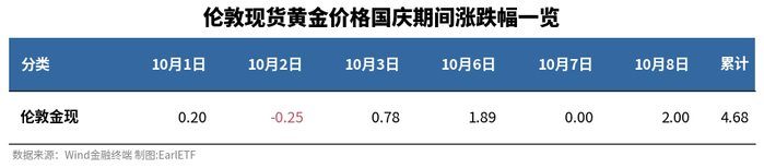 在国庆长假期间,黄金已经历史上首次站上了 4000 美元/盎司,这对于 A股市场相关 ETF ,如上海金 ETF(518600.SH,联接A/C/F类008986/008987/021738)等 ,显然是大利好。下表是截至北京时间 8 日 16 点的数据。