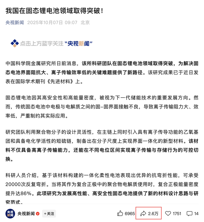 当然,电池板块的上涨,也不奇怪。下面是来自央视新闻的报道,请不仅注意新闻本体,更要注意转发、点赞数,可见这则新闻的群众基础。