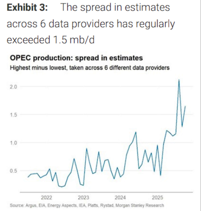摩根士丹利追踪的六家专业数据提供商——Argus、美国能源信息署、Energy Aspects、国际能源署、Rystad和标普全球大宗商品——对OPEC原油产量的估算在2020-2022年期间误差仅为400-500千桶/日,但从2023年初开始出现分化,到2025年分歧已扩大至常态性超过1.5百万桶/日。