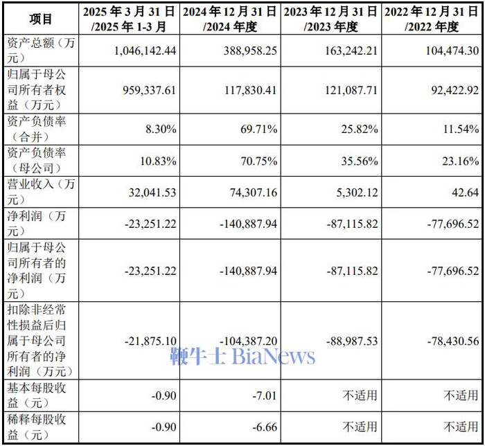 但需要注意的是,沐曦成立至今尚未盈利。招股书披露,2022至2024年、2025年1至3月,营业收入分别为42.64万元、5302.12万元、7.4亿元和3.2亿元,归母净利润分别为-7.8亿元、-8.7亿元、-14亿元和-2.3亿元。根据沐曦预计,公司达到盈亏平衡点的预期时间最早为 2026 年。