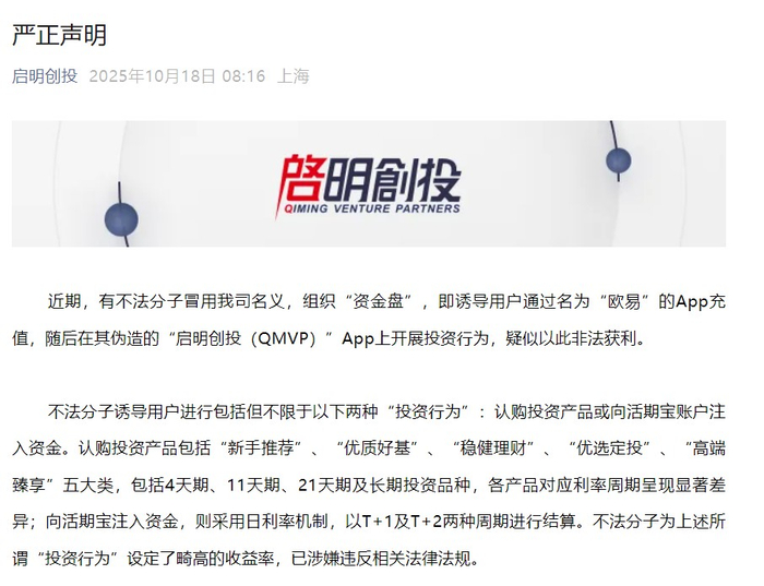 截至最新,启明创投已连发3次严正声明,强调私募基金仅向特定符合条件的合格投资人募集资金,启明创投无官方App。