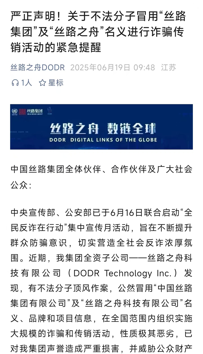 今年5月-6月期间,丝路之舟科技有限公司在微信公众号密集发布了十余条严正声明,称近日发现有不法分子冒用公司名义于2024年10月1日上线名为“DODR”的非法App,并在全国建立或授权建立“DODR丝路之舟信息咨询处”,通过非法获取的公司介绍和视频等信息,在平台发布虚假的国际工程项目,诱导公众投资并承诺高额回报和所谓股权激励。这些虚假宣传和集资行为已经构成犯罪。