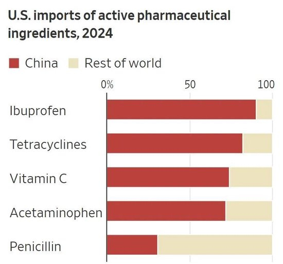 其三为医药行业。报道称,虽然美国药店或柜台上销售的药物通常不会标注“中国制造”,但其原料药或生产原料药所需的前体化学品,往往由中国供应。