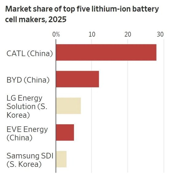 目前,全球前两大电池生产商均为中国企业:宁德时代和比亚迪。即便电池在其他地区生产,其核心组件也有相当一部分来自中国。