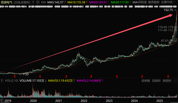 2004年上市的思源电气,上市以来股价长期稳步上涨,2019年之后更是加速上涨,从2019年年中7.55元的低点到今天盘中最高的152.75元,6年多时间涨幅高达近20倍,创造了又一个A股财富神话。