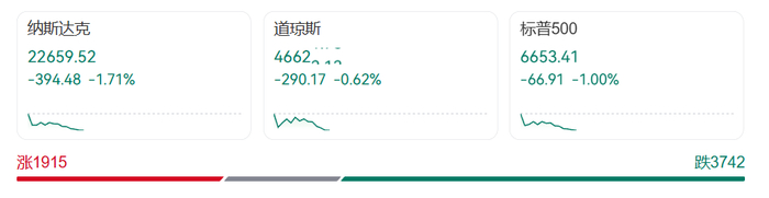 北京时间11月7日晚,美股三大指数集体低开,随后跳水。截至发稿,道指下跌0.62%,纳指下跌1.71%,标普500指数下跌1%。