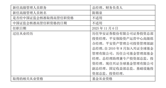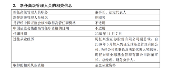 11月7日,兴证全球基金公告称,公司原总经理庄园芳升任董事长,公司原副总经理陈锦泉自2025年11月6日起担任公司总经理、财务负责人。