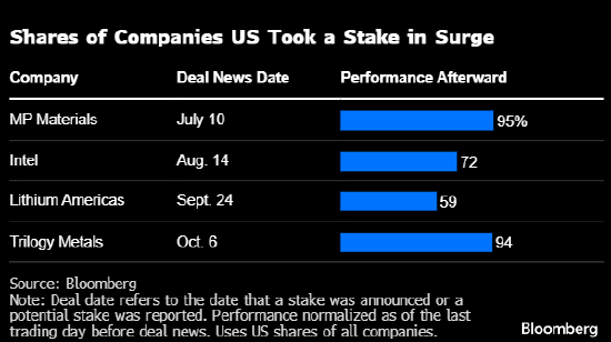 紧接着,特朗普政府在9月份入股美洲锂业5%的股份,之后在上月入股关键金属勘探商Trilogy Metals Inc. 10%的股份。商务部长霍华德·卢特尼克还曾表示投资国防承包商的股份也在考虑之列。