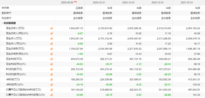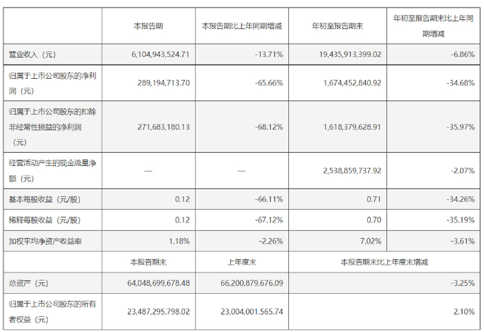 今年前三季度,龙佰集团实现营业收入194.36亿元,同比下降6.86%;归母净利润为16.74亿元,同比下降34.68%。