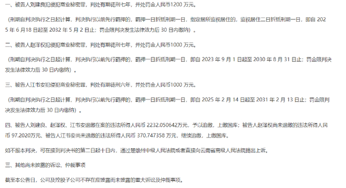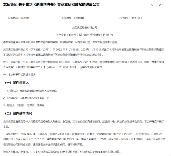 龙佰集团发布诉“内鬼”案一审判决结果 主犯被判6-7年有期徒刑