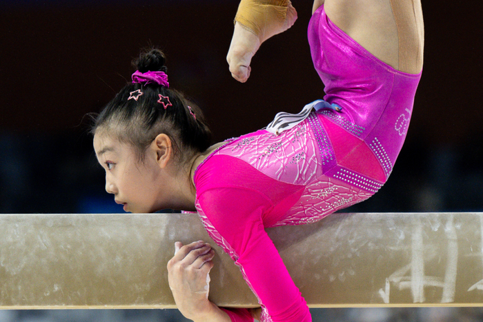 2个月前在肇庆的同一片赛场,虽然荣膺全运会体操青年组3金王,但没人敢想广东思腾队15岁的柯沁沁能在第十五届全国运动会成年组女子全能决赛中加冕,成为在同届全运会包揽体操青年组、成年组全能金牌的历史第一人。