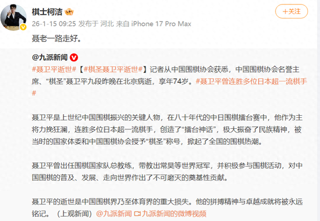 柯洁发微博悼念聂卫平:聂老一路走好。