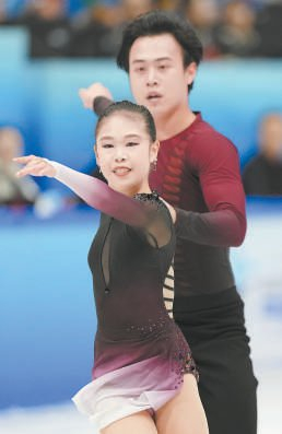 柳鑫宇/王诗玥(左)亮相冰舞韵律舞比赛。本报记者 刘平摄