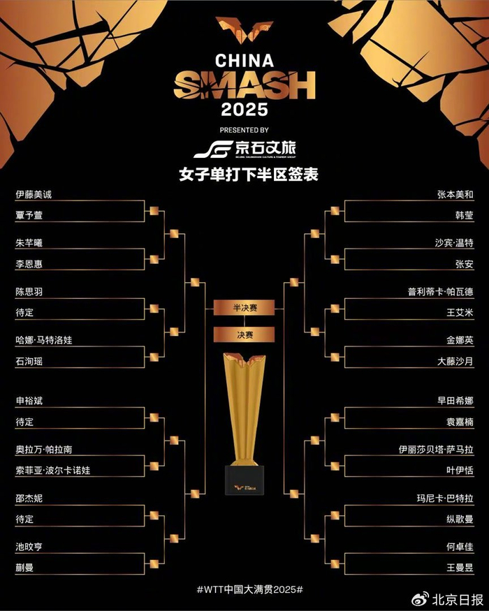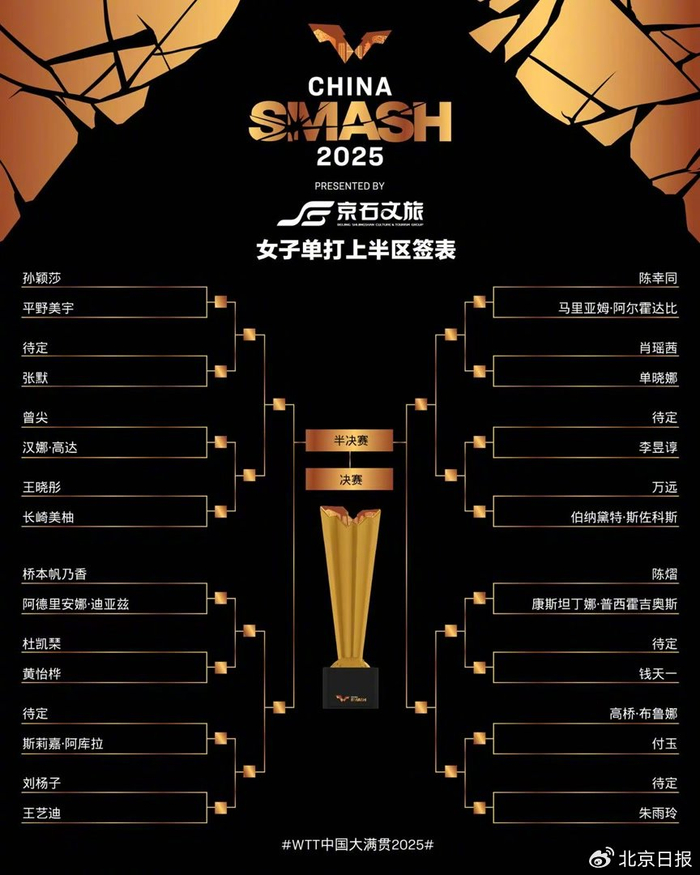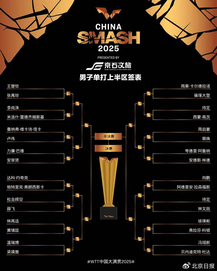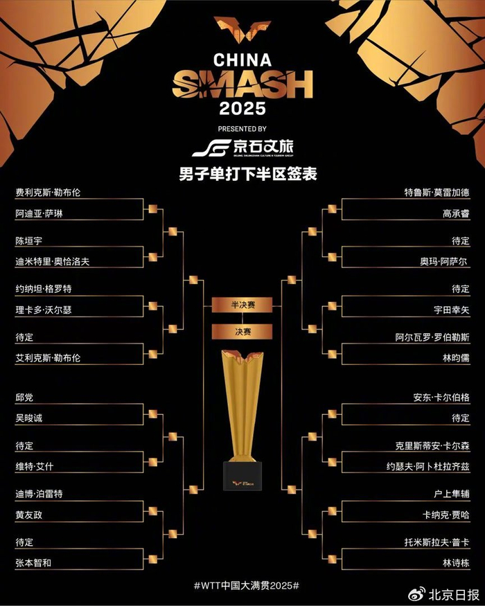 9月26日,WTT中国大满贯抽签仪式在北京法海寺壁画博物馆举行,本次比赛单打签表就此揭晓。国乒名将各自落位,将向冠军奖杯发起冲击。