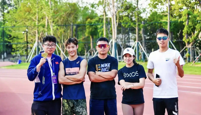 邓信锐(左二)与训练团队成员合影。这个训练体系类似于苏炳添曾经使用过的“冠军模型”。