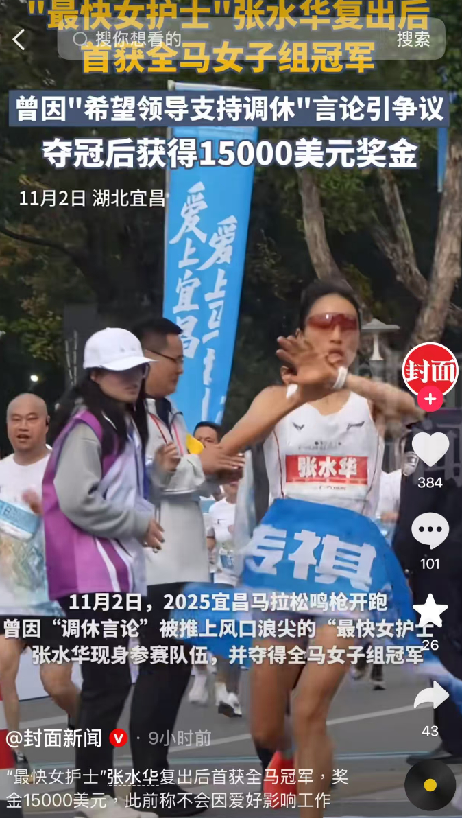 2025宜昌马拉松的发令枪响起时,没有人预料到,冲过终点带的第一位女子选手,会是那位曾因“调休言论”陷入舆论风暴的“最快女护士”——张水华。