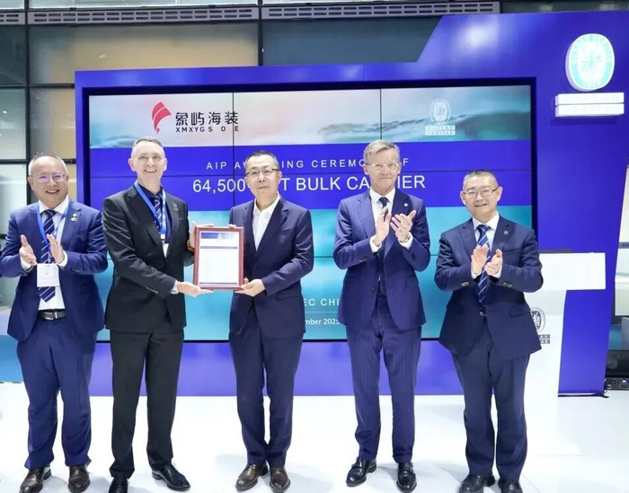 日前,象屿海装自主研发的“吉象”二代64500DWT散货船成功获得英国劳氏船级社(LR)与法国船级社(BV)颁发的原则性认可(AIP)证书,标志着象屿海装在船舶自主研发与技术认证领域迈出坚实步伐,也为全球散货船市场提供了实用环保的装备选择。