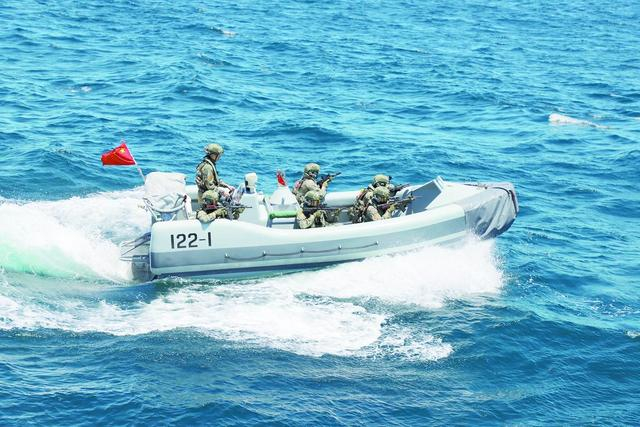 解救被劫持船舶科目中,特战队员乘坐小艇出击。