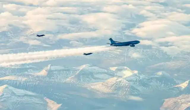 丹麦F-35A战斗机在法国空中加油机的支持下飞向格陵兰岛。