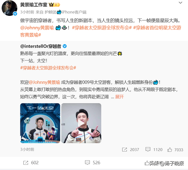 1月22日,“穿越者”公司通过微博宣布,演员黄景瑜成为该公司009号太空游客,将奔赴更辽阔的太空舞台。该公司还宣布,001号太空游客为智元机器人CMO邱恒。