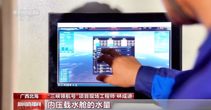 “三峡领航号”项目现场工程师 林成迪:在风机吊装的过程中,浮体的动态压载系统发挥着“智能平衡仪”的作用,我们通过调整浮体三支侧立柱内压载水舱的水量,让浮体的水平度始终保持在千分之三以内。