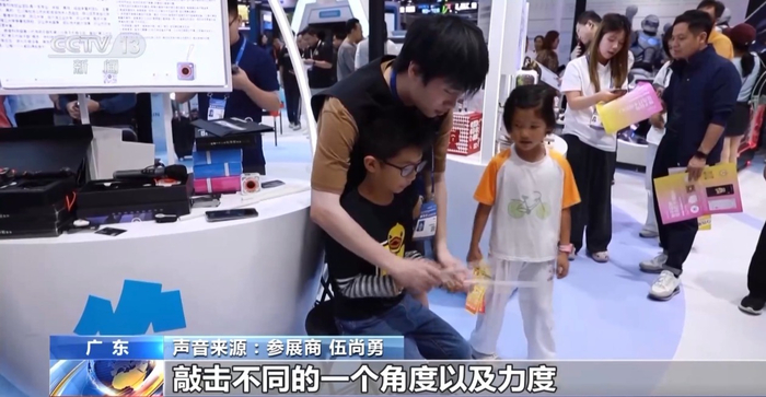 参展商 伍尚勇:它会把声音传到小音响上面。可以通过敲击不同的角度以及力度,发出不同的声音,跟真实架子鼓声音的相似度达到了95%以上。