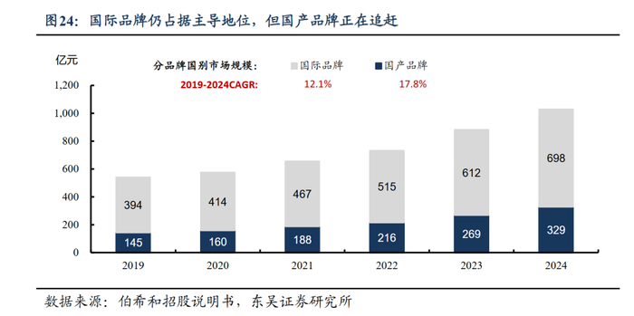 差异化的定位也形成了国际品牌占主导地位,国产品牌增速更快的市场格局。数据显示,在2024年中国高性能户外服饰1027亿元的市场中,国际品牌规模为698亿元,占比68%,仍国产品牌则实现了更快的增长。2019年至2024年5年期间,国际品牌与国产品牌的CAGR分别为12%和18%。