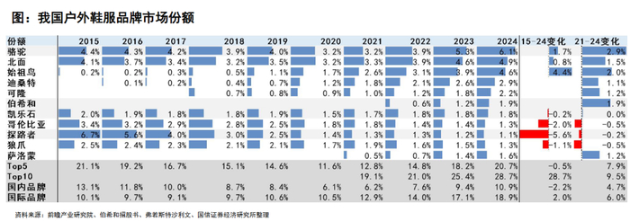 前瞻产业研究院数据显示,国产头部品牌份额呈V形变化,TOP10品牌2015/2021/2024年份额分别为13%/6%/11%。骆驼是目前国内户外市场第一大品牌;伯希和作为新兴户外品牌近年来增速迅猛,2024年的销售体量大约在17.5亿元,在国产品牌中位列第二。
