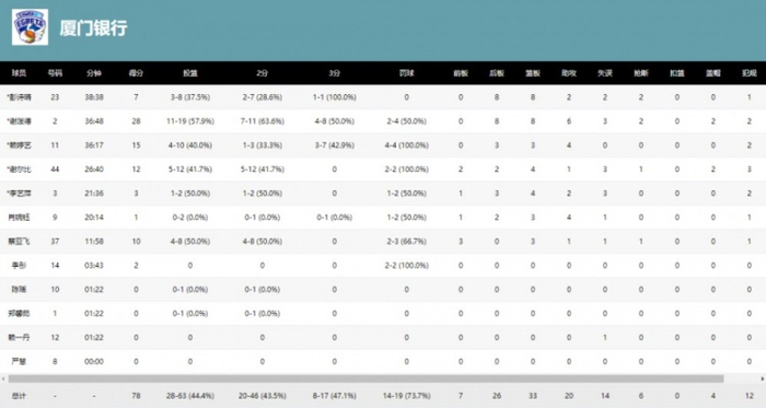 球队方面,厦门银行整体投篮命中率44.4%和三分命中率47.1%还都高于对手的44%、32.1%;但厦门银行33个篮板和7个前场篮板都少于合肥女篮的40个篮板和11个前场篮板;助攻上,厦门银行送出20次还比对手多出4次;失误上厦门银行14次比对手多3次;抢断上厦门银行仅6次,合肥女篮则是11次。球员方面,厦门银行对合肥女篮三位外援防守不好,三人合计拿到53分;而且合肥女篮国内球员也有三人接近上双。厦门女篮这边,谢泼德苦苦支撑空砍28分8篮板6助攻,赖婷艺3记三分贡献15分,谢尔比也拿到12分,蔡亚飞得分上双,彭诗晴状态一般拿到7分。2026年1月16日,厦门银行女篮将继续客场对阵合肥文旅,希望球队好好总结本场比赛,取长补短,争取下场复仇。