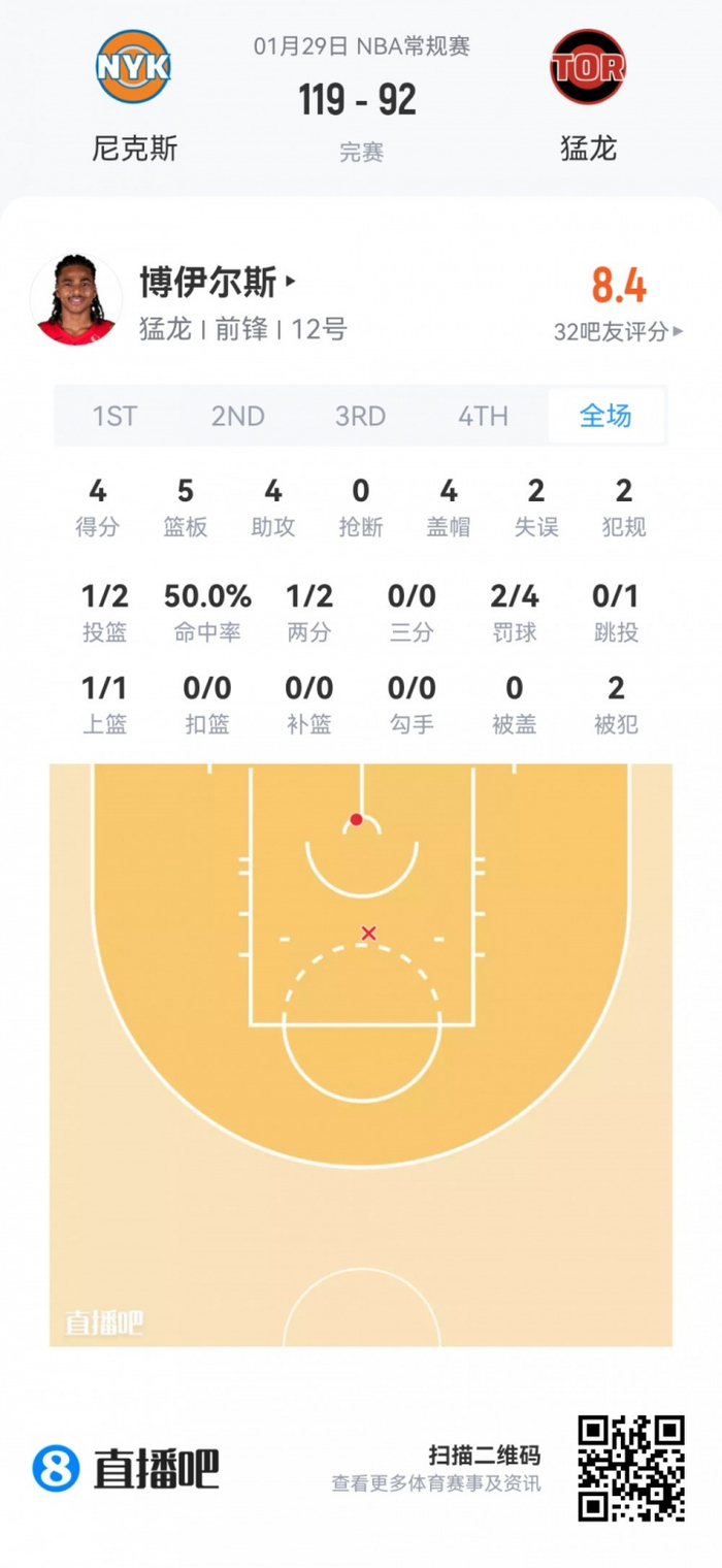 猛龙首轮9号秀博伊尔斯 登场28.3分钟