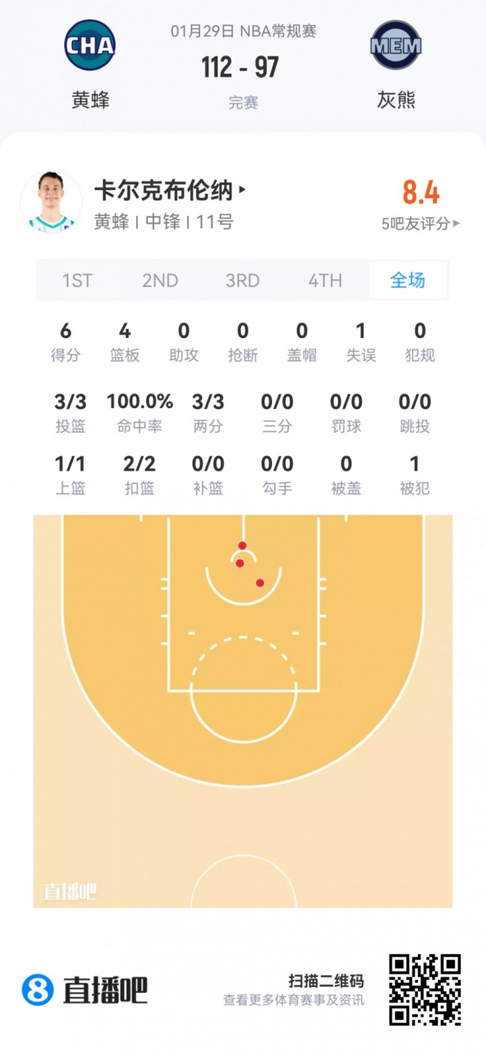 黄蜂次轮34号秀卡尔克布伦纳 登场14.9分钟