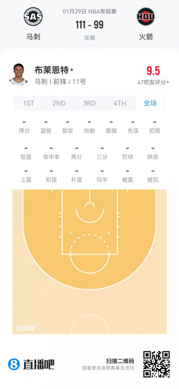 马刺首轮14号秀卡特·布莱恩特 登场3.3分钟