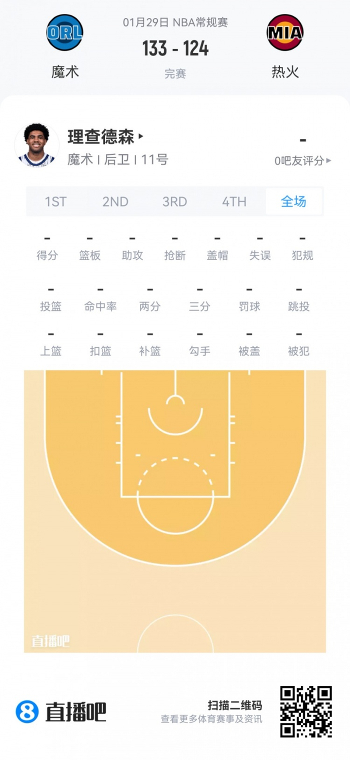 魔术首轮25号秀小理查德森 登场2分钟
