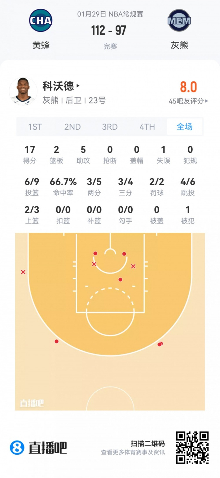 灰熊首轮11号秀科沃德 登场26.8分钟